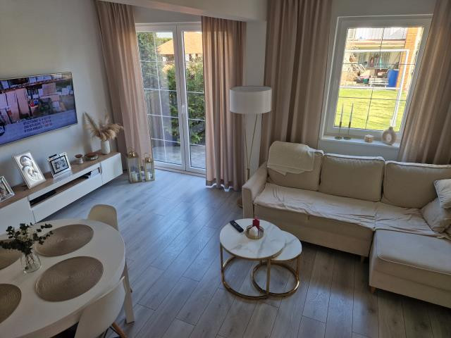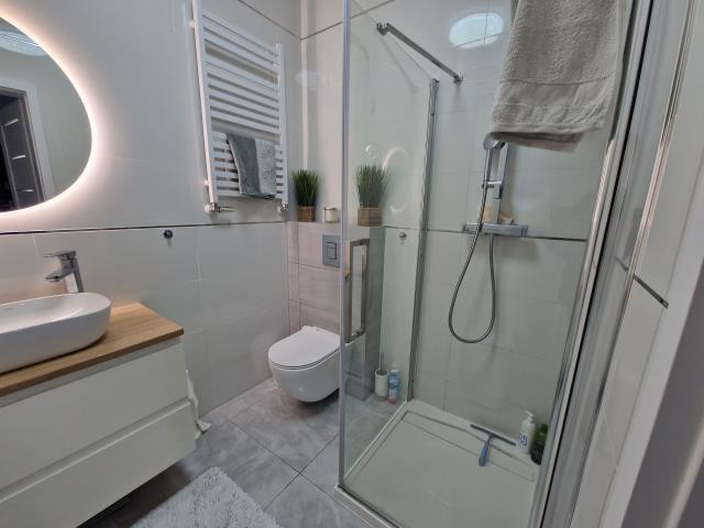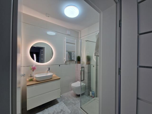 pierwszym budynku na parterze : salon z wyjściem na balkon ,duża kuchnia 15 m2, łazienka z kabiną prysznicową świeżo po remoncie, przestronny hol .